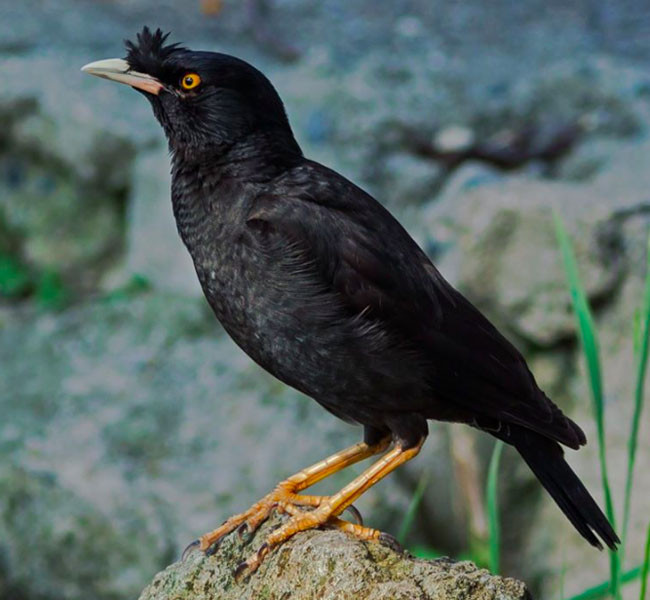 Head and neck: Elongated forehead feathers forming a conspicuous frontal crest; eye dull yellow to brown; bill light yellowish orange.