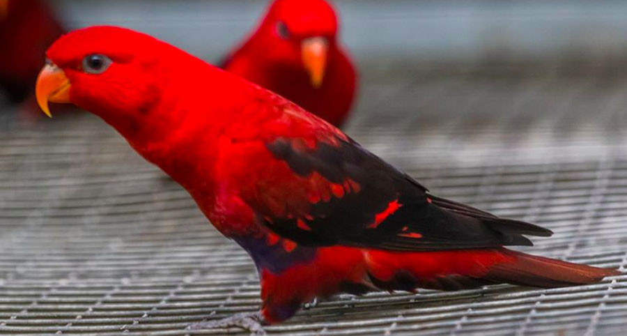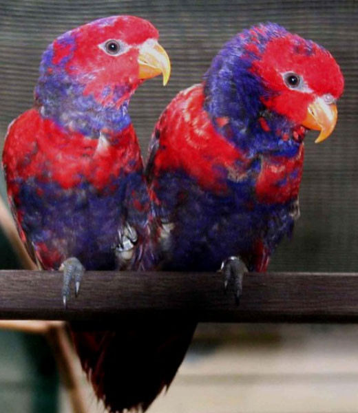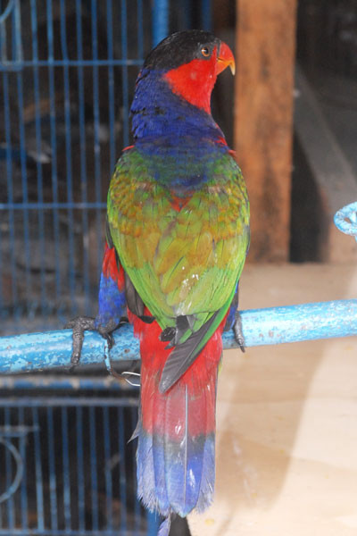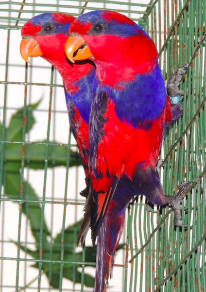 Head and neck: Crown black; head and throat red; nape purplish blue; bill orange. Body: Nape, up...