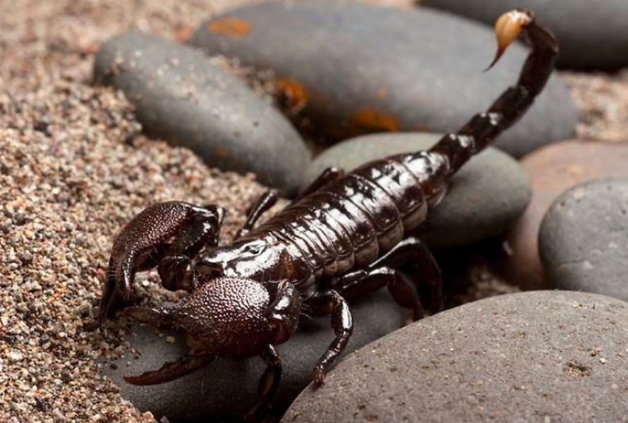 Head and body: uniform bluish black Limbs: chela large, black; metasoma segment 1 to 4, round, 5t...