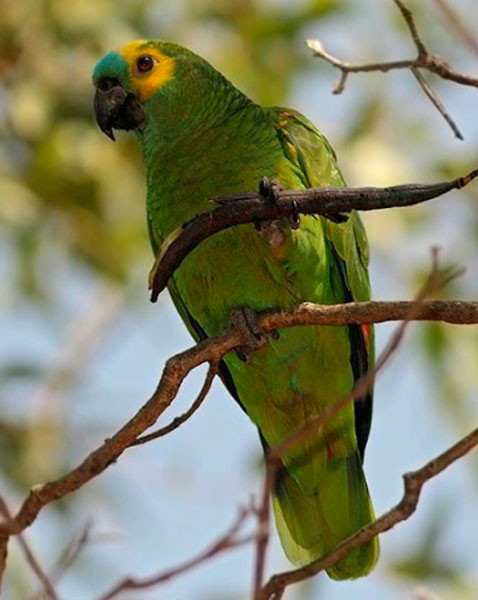 Head and neck: Forehead, lores, and sides of head bluish green; crown and nape bright blue; eye yell...