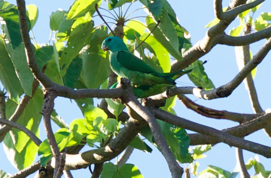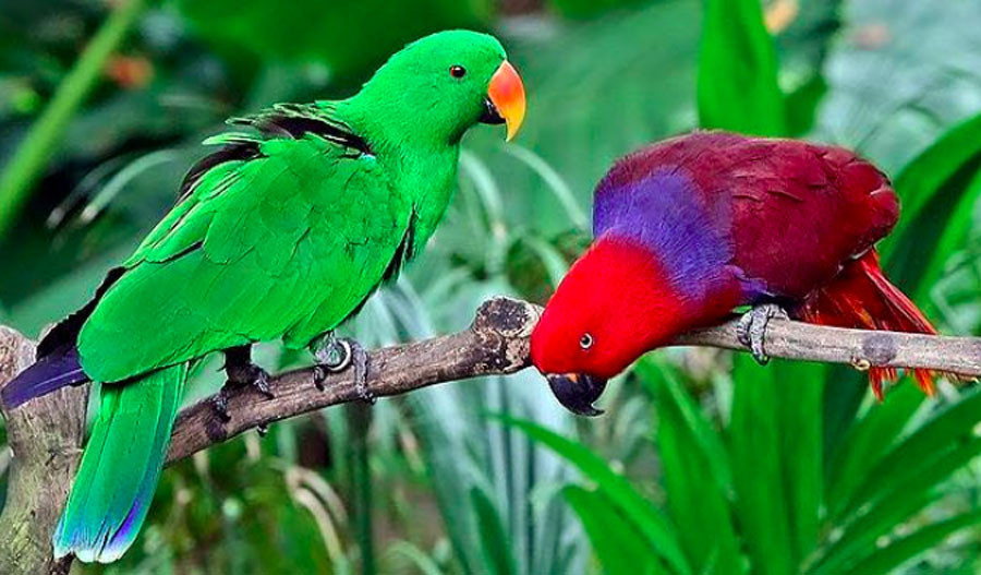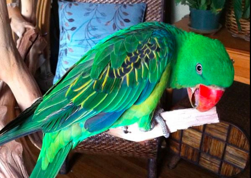 Head and neck: Entire head bright green; bill large, red with orange tip; cere black; eye inner ring...