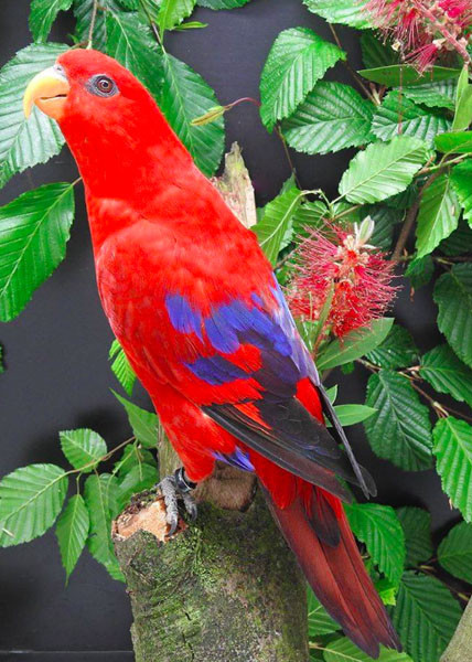 Head and neck: bright red; throat with blue patch; bill white. Body: Predominantly red; back and sc...