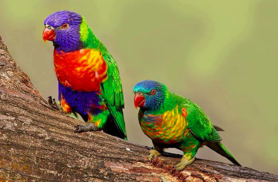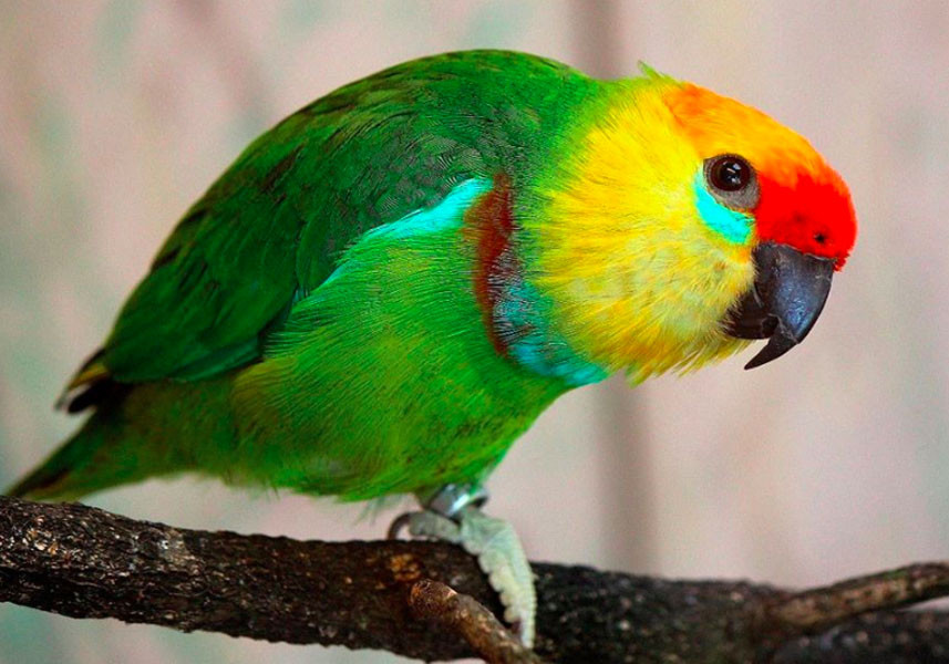 Head and neck: Forehead and lores deep red, diagnostic; crown light blue; nape green; cheek yellow o...
