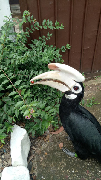 Head and neck: Head and neck rufous brown; casque and bill red; casque large and flat extending to a...
