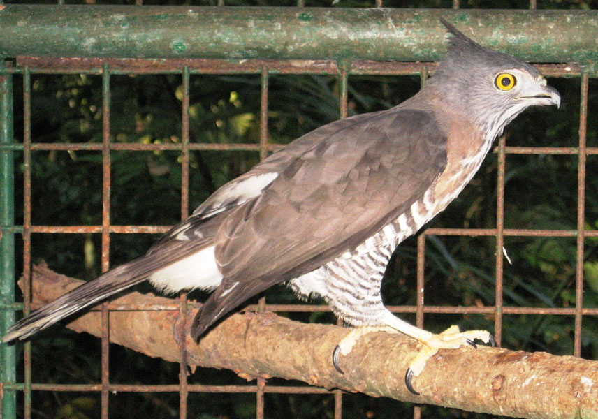 A medium Accipiter; 47-53 cm TL; Head and neck: short fan-shaped crest with buff edges; crown, crest...