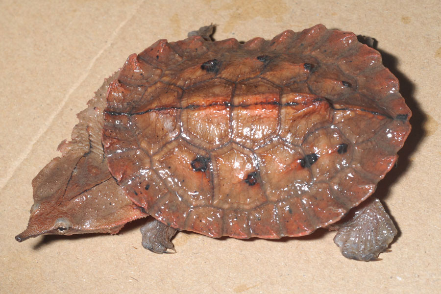 Head and neck: dark brown; dorsal of head is covered with large bony plate; flattened tubercles on f...