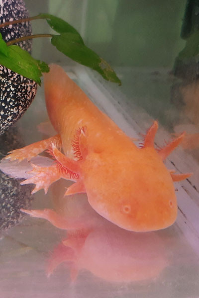 Head and neck: greenish grey with small dark spots; eyes small; 3 pairs of external gills behind the...
